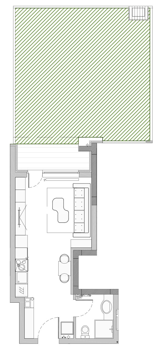 Състои се от едно голямо помещение обособено антре,дневна с кухня и трапезария, баня с тоалетна и двор 33м2. Изложение -север. В момента сградата е на АКТ 15, АКТ 16 се очаква септември тази година